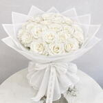 Revela la pura elegancia con este impresionante Mono Bouquet, meticulosamente compuesto por 25 inmaculadas rosas blancas. Delicadamente envuelto en cinco pliegos de papel de envoltura de primera calidad, este ramo exuda un aura sublime. Un toque de sofisticación se añade con dos tiras de cinta de satén que lo atan, creando una pieza artística inspirada en la naturaleza. Este ramo es el símbolo de la sofisticación y la pureza, perfecto para expresar emociones sentidas.