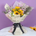 5 girasoles, 7 Matthiola rosas, 11 rosas blancas, 5 tallos Solidaster, hojas: 3 de palma Erica y 2 de tallo Song of Jamaica, bellamente envueltos en papel blanco Love in Mist y mármol rosa, atados con cinta negra.