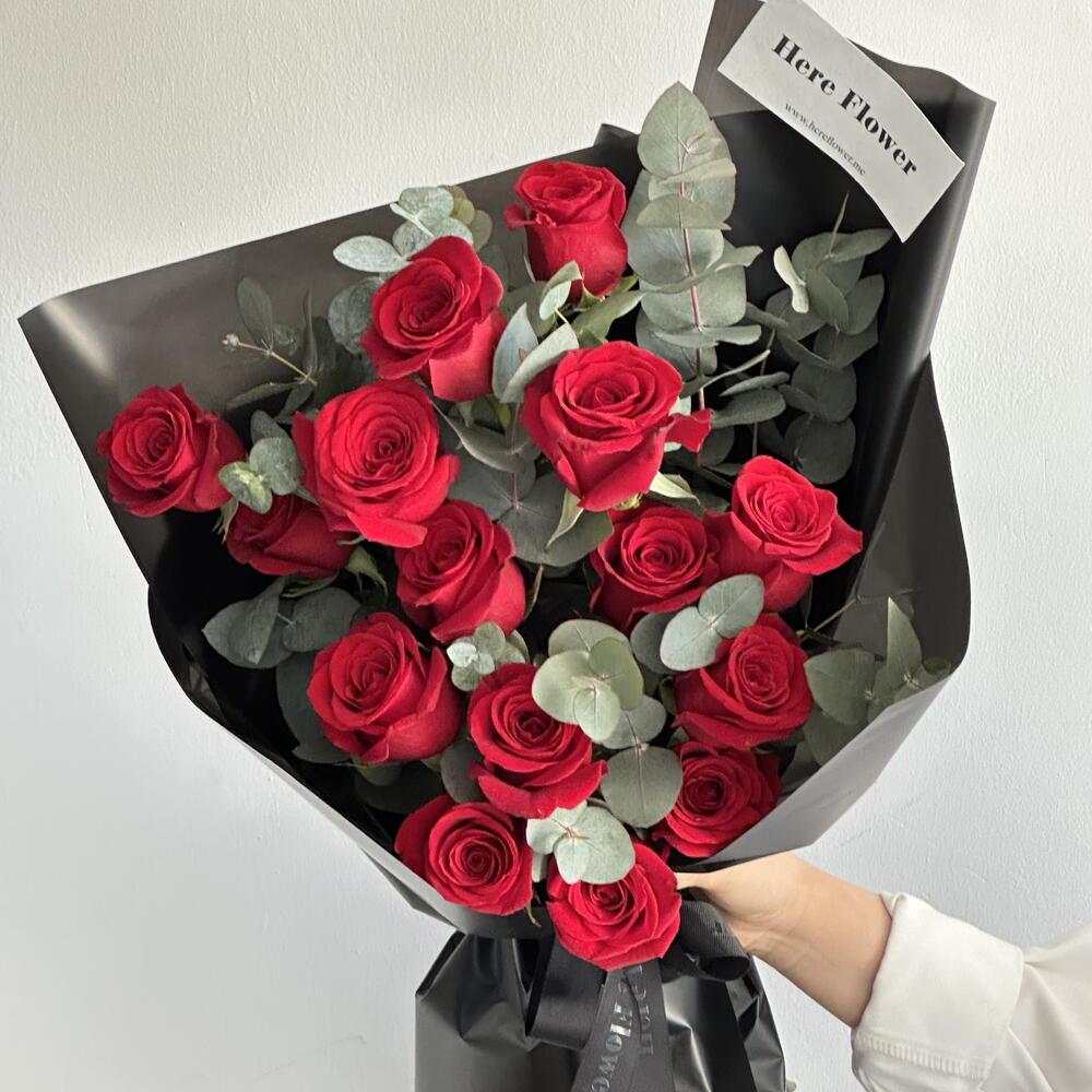 Un arreglo atemporal de rosas rojas clásicas combinado con eucalipto fresco, elegantemente envuelto en negro para un toque de sofisticación.