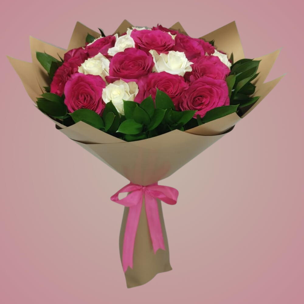 Deleite sus sentidos con este encantador Ramo Mono. Perfectamente equilibrado con una composición de 10 rosas blancas prístinas y 10 vibrantes rosas fucsia, este ramo es una exquisita muestra de amor, admiración o aprecio. Cada tallo de este arreglo añade encanto y sofisticación, convirtiéndolo en una elección irresistible para cualquier ocasión. Elegante y a la vez seductor, ¡este ramo es un verdadero deleite para la vista!