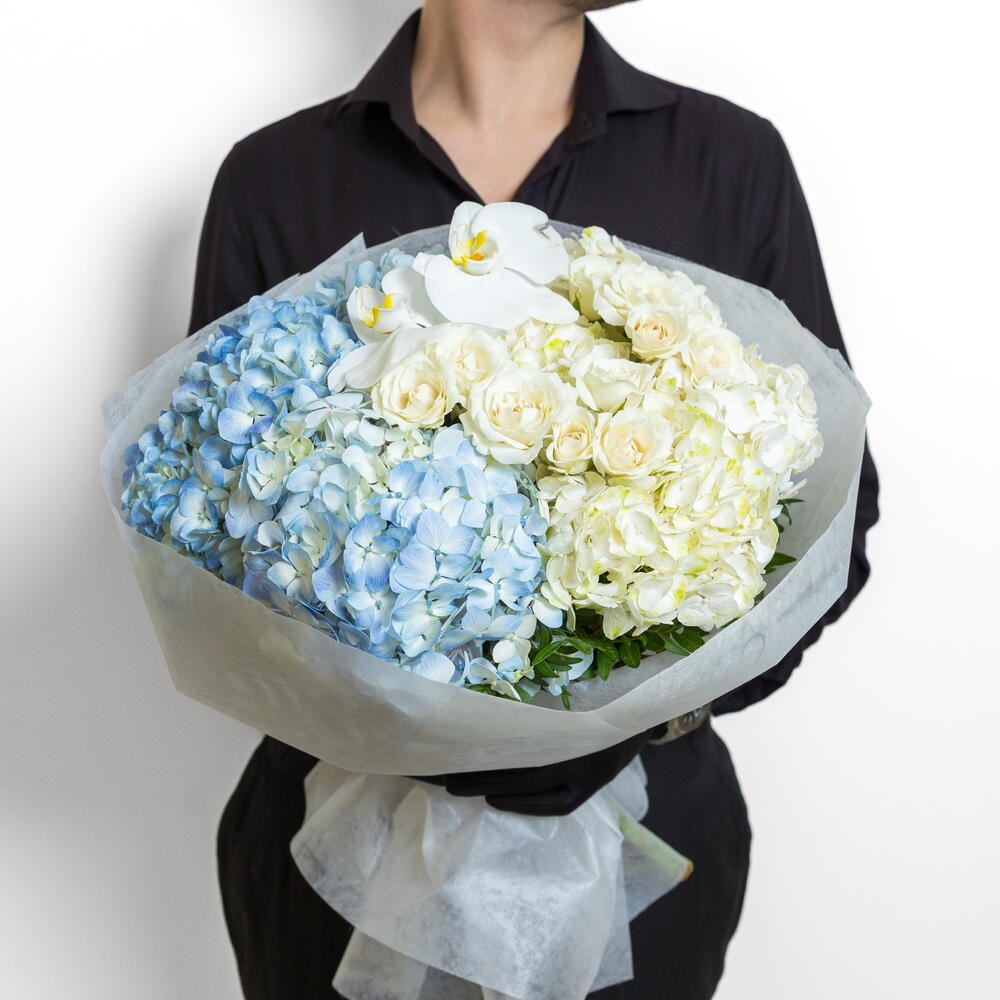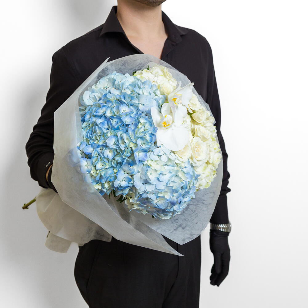 Pistacia - 5 ud. hydrangea white - 4 ud. rosa spray blanca - 10 ud. phalaenopsis blanca - 1 ud. hortensia azul claro - 4 ud.