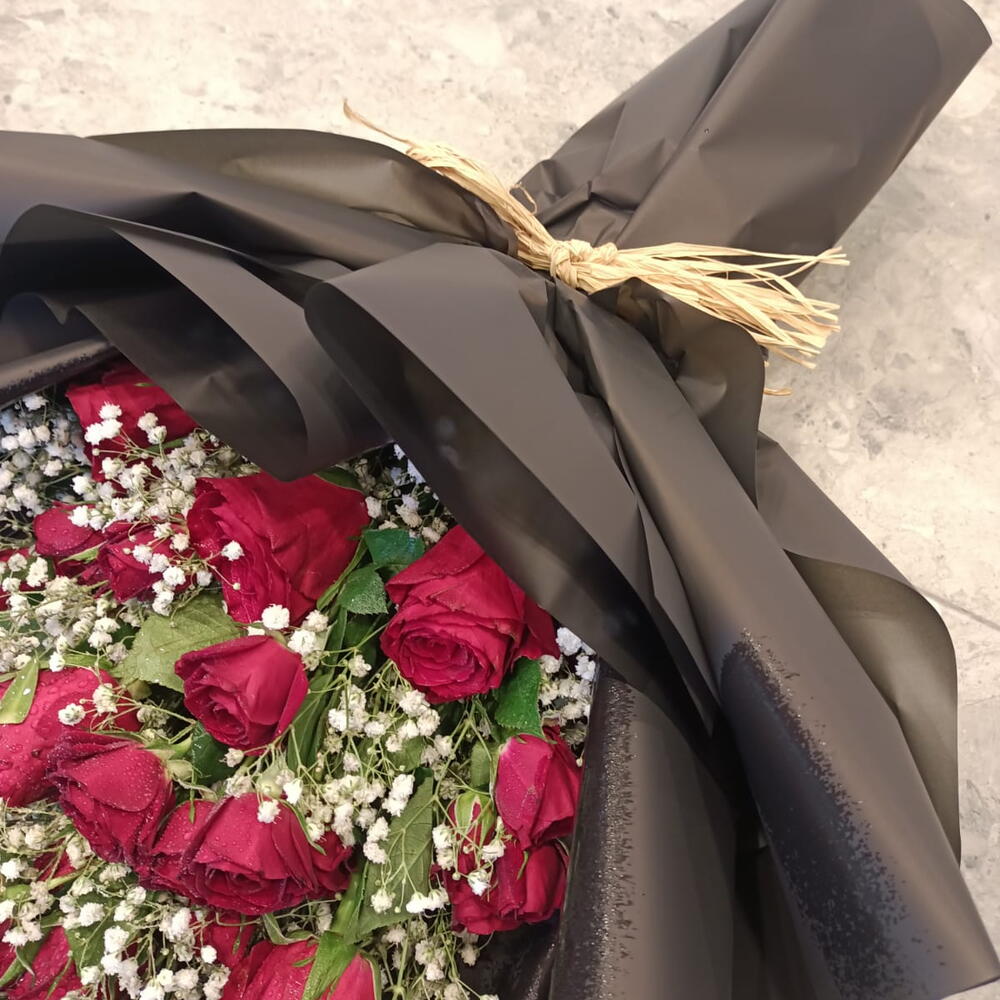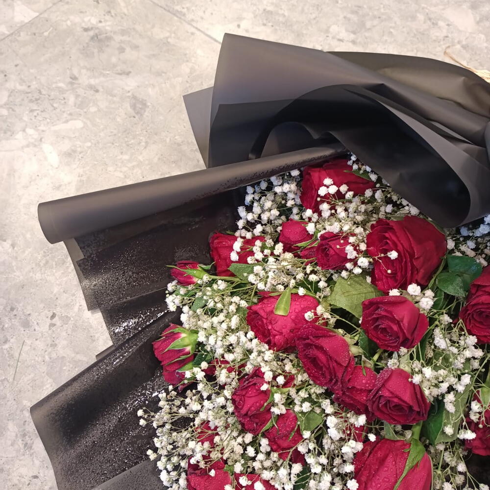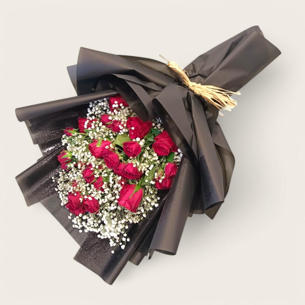 Revela la belleza de la noche con este impresionante arreglo. Rosas rojas intensas y flores blancas etéreas emergen de un llamativo envoltorio negro, creando un contraste cautivador.