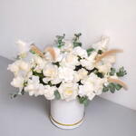 Atemporal y sofisticada, esta composición en caja sombrerera totalmente blanca encarna pura elegancia y gracia. Una mezcla armoniosa de rosas, claveles y delicados toques de elementos secos y eucalipto crea una composición serena y lujosa. Perfecta para bodas, aniversarios, gestos de condolencia o para una decoración del hogar con estilo, este ramo transmite una sensación de calma y belleza refinada. Para mantener su aspecto fresco, añada regularmente agua limpia y fresca al oasis floral dentro de la caja. Coloque la composición lejos de la luz solar directa, fuentes de calor y corrientes de aire. Retire las flores marchitas para asegurar que el ramo se mantenga radiante y hermoso.