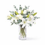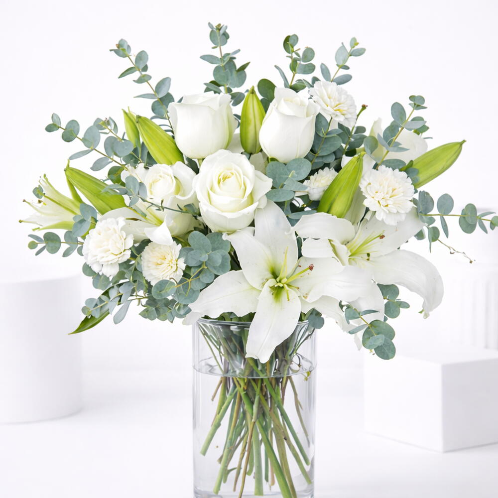 The Snow White Lily Rose Vase is a timeless floral arrangement that showcases the beauty of pure white blooms. Featuring elegant white roses and delicate white carnations paired with graceful white oriental lilies, this design creates a soft and sophisticated look that symbolizes purity, peace, and elegance. Fresh eucalyptus leaves add a natural touch of greenery, enhancing the arrangement with subtle texture and freshness. Beautifully arranged in a clear cylinder glass vase, this elegant display is perfect for expressing heartfelt sentiments, celebrating special occasions, or adding a refined floral touch to any home or office space. Includes:- 7 White Roses 7White Carnations 3 Stems White Oriental Lilies 4 Stems Fresh Eucalyptus Leaves Clear Cylinder Glass Vase.