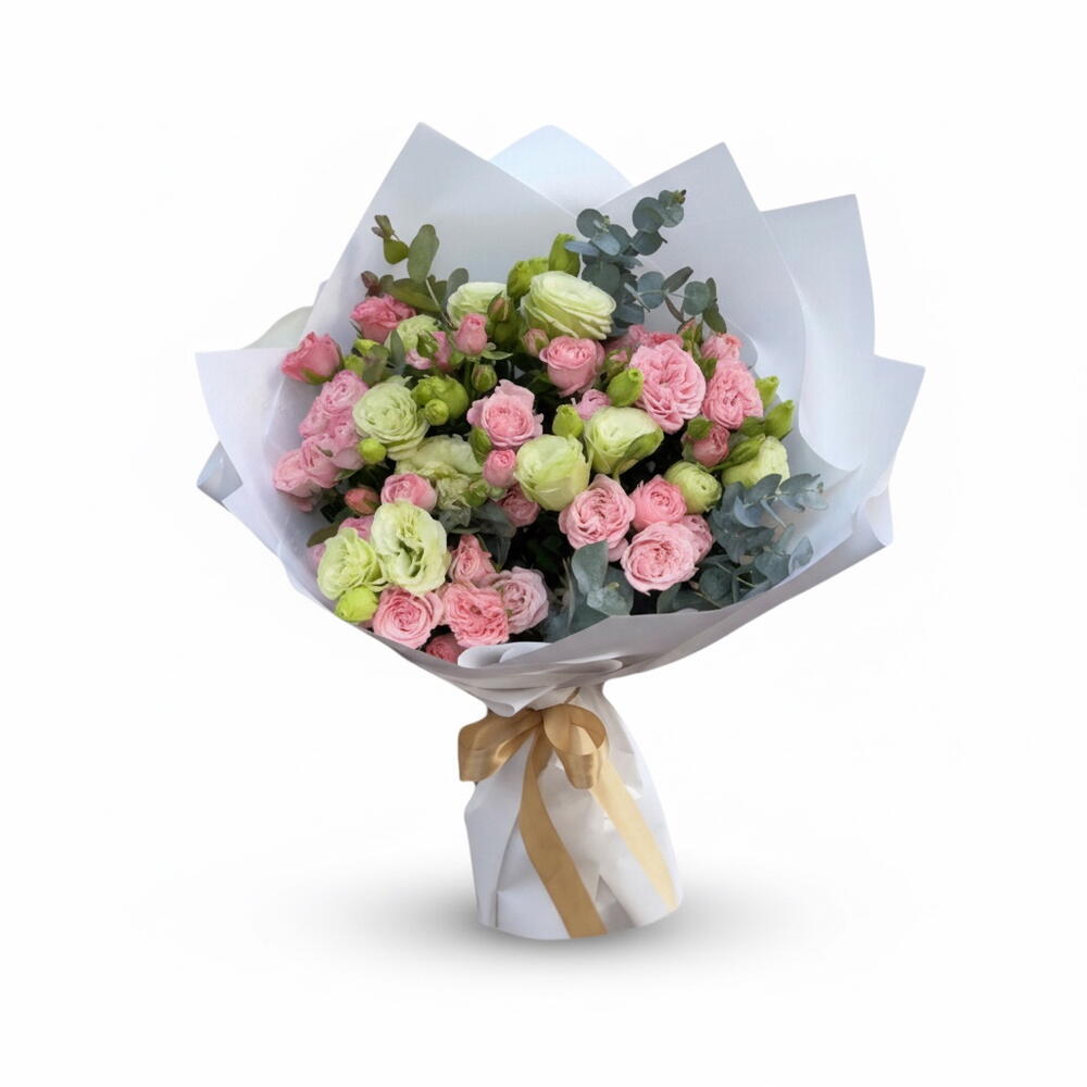 pink spray rose - 9 ud. rosa blanca en aerosol - 6 ud. eucalyptus leaves - 7 ud. papel de regalo blanco - 2 ud.