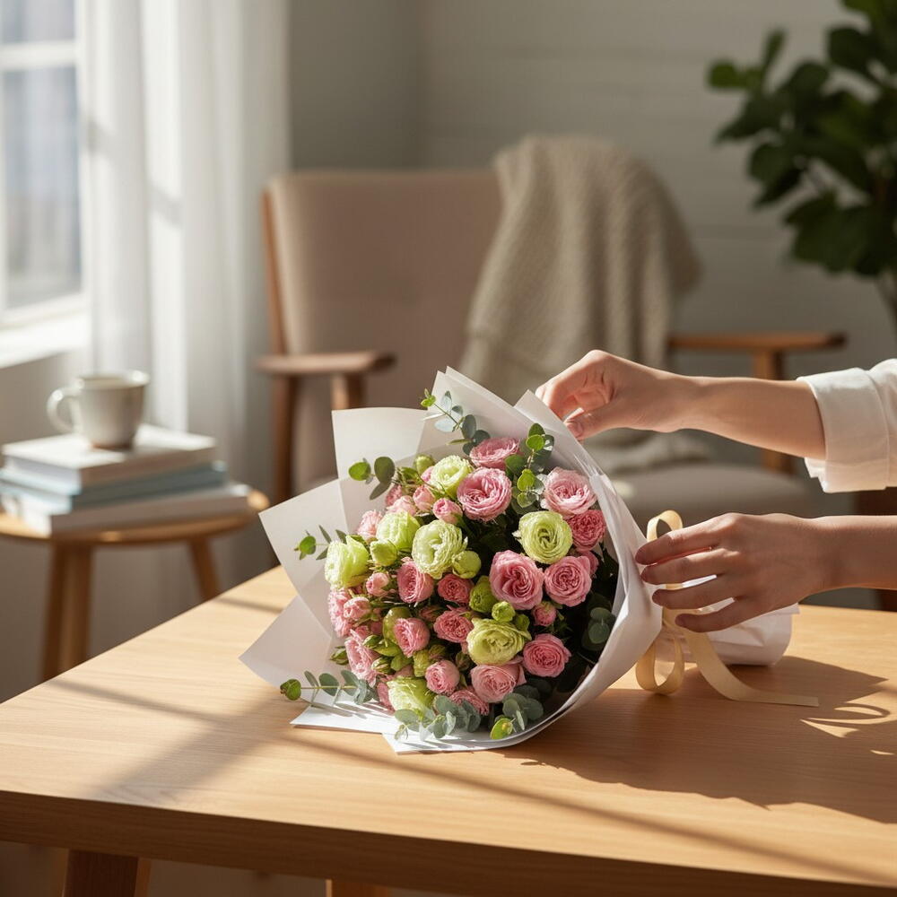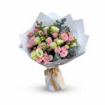 Un delicado ramo de 6 elegantes Estoma blancas y 9 dulces rosas spray rosadas, bellamente envuelto en blanco inmaculado. Este encantador arreglo irradia pureza, gracia y romance atemporal, haciéndolo perfecto para cualquier ocasión emotiva. Mantén tus flores frescas y vibrantes cortando los tallos en diagonal, cambiando el agua diariamente y colocándolas en un lugar fresco, alejado de la luz solar directa y de corrientes de aire 30 X 45