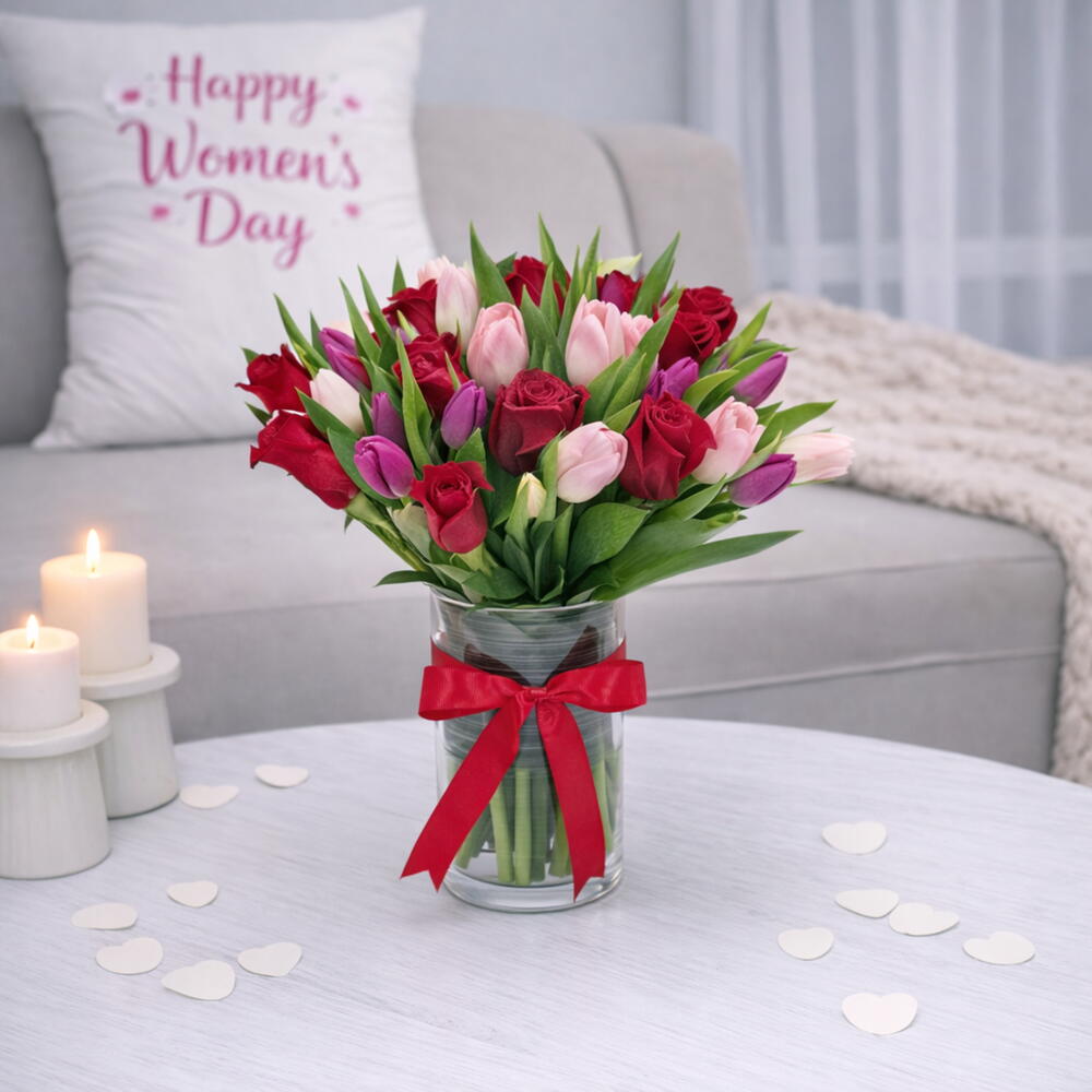 Des - Arrangement of 11 Red Roses, 25 Pink, Purple and White tulips in a Cylinder glass vase tied with red Ribbon Bow.