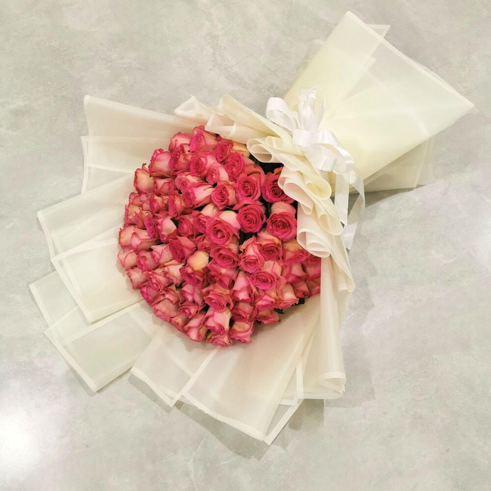 Permítete experimentar una grandiosidad de belleza con nuestro Especial del Florista! Este ramo impresionante muestra no menos de 100 exquisitas rosas, cuidadosamente seleccionadas a mano y maravillosamente arregladas por nuestros floristas profesionales. Cada flor está envuelta con elegancia utilizando 10 piezas de material de envoltura de primera calidad para resaltar su encanto y su finura. Para añadir un toque personal a tu gesto, el ramo incluye una tarjeta donde puedes escribir mensajes conmovedores para tu ser querido. Expresa tus sentimientos con este magnífico ramo y haz que cada ocasión sea memorable.
