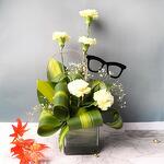 Detalles del producto: 5 tallos de claveles blancos. 1 tallo de gypsophila blanca. 6-8 tallos de hojas de Dracaena Fragrans Massangeana. Una pegatina de marco negro. Hermosamente hecho a mano en un jarrón cuadrado de vidrio de 10x10 cm
