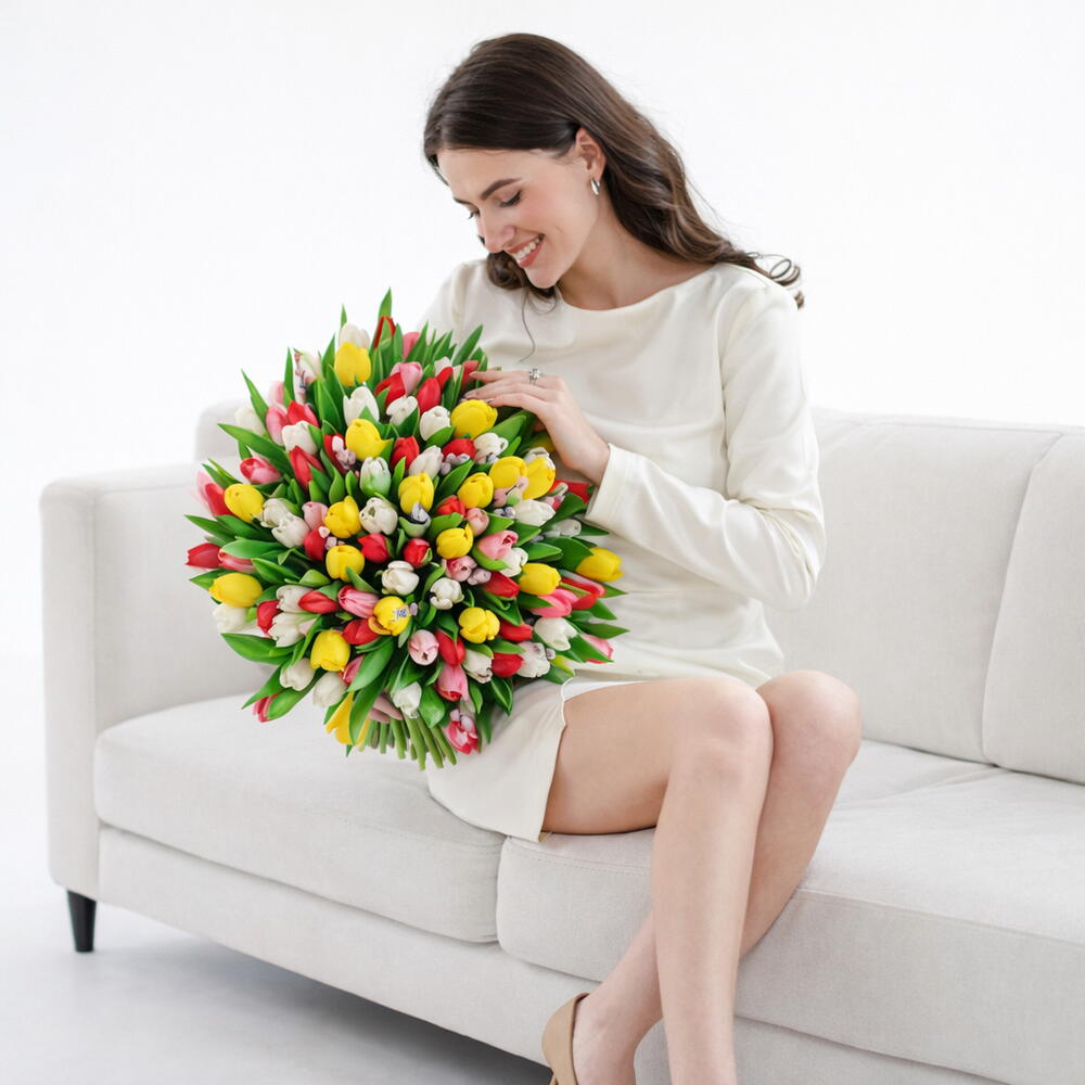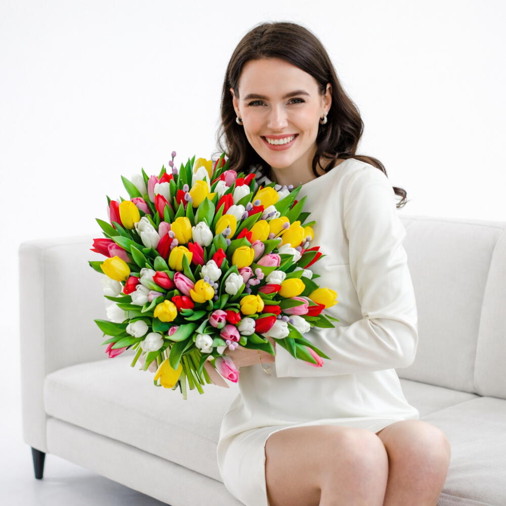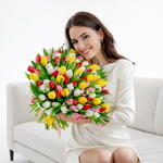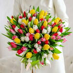 Spring Harmony is a vibrant and joyful bouquet that captures the beauty of the spring season. This elegant arrangement features a rich mix of colorful tulips in sunny yellow, soft pink, pure white, and deep red shades. The lush green leaves and carefully arranged round shape create a full, voluminous bouquet that feels fresh, bright, and sophisticated.