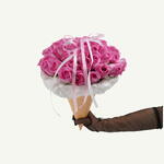 Ramo atado a mano de 45 rosas rosadas, elegantemente elaborado en un envoltorio con forma de cono de helado, para un toque divertido y dulce.