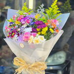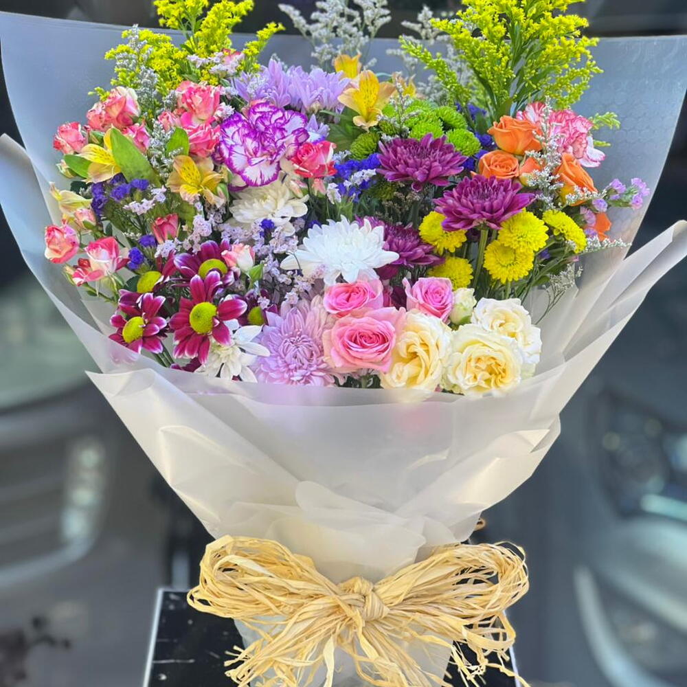 Este arreglo rebosa de colores vibrantes y energía alegre, creando un equilibrio perfecto entre elegancia y alegría. Presenta una vibrante combinación de: Rosas rosas y crema: símbolos de admiración y dulzura. Crisantemos morados y blancos: aportan textura y volumen. Sólido amarillo brillante (vara de oro): aporta altura y un contraste soleado. Rosas en spray naranja: un toque cálido y alegre. Delicadas flores de relleno en tonos lavanda y verde: aportan suavidad y profundidad.
