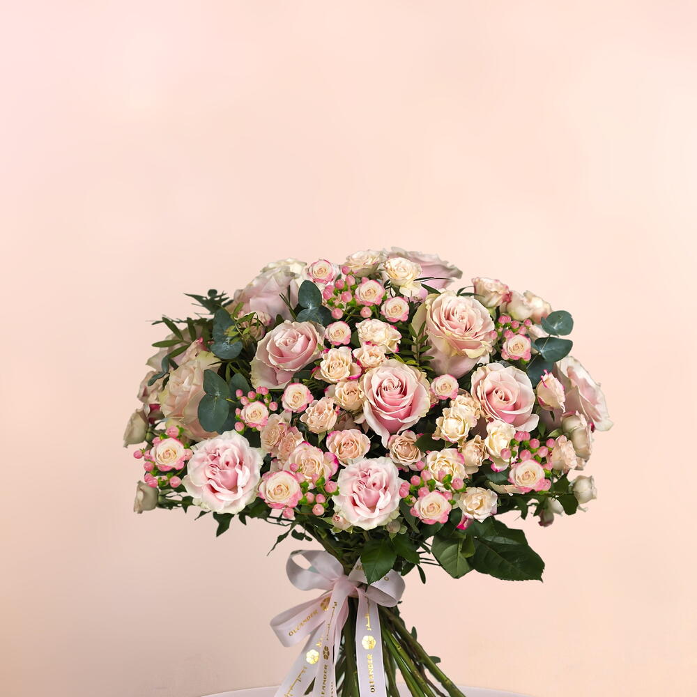 Pink rose - 20 ud. hypericum - 15 ud. rosa spray rosada - 15 ud. eucalipto - 5 ud.