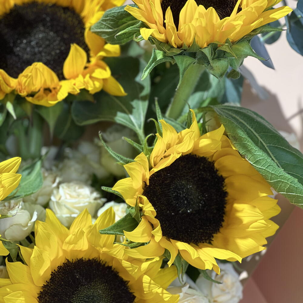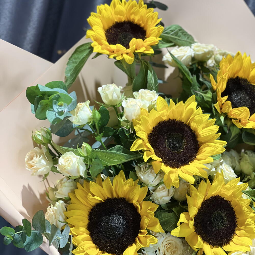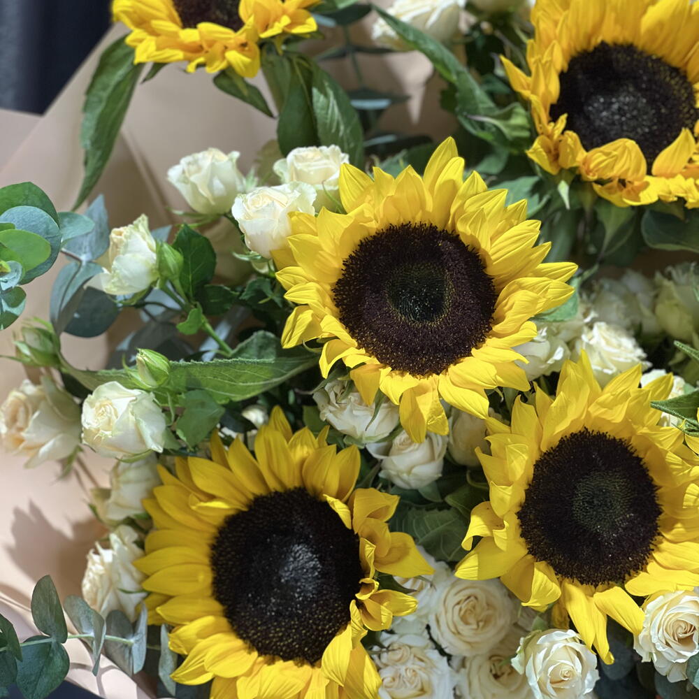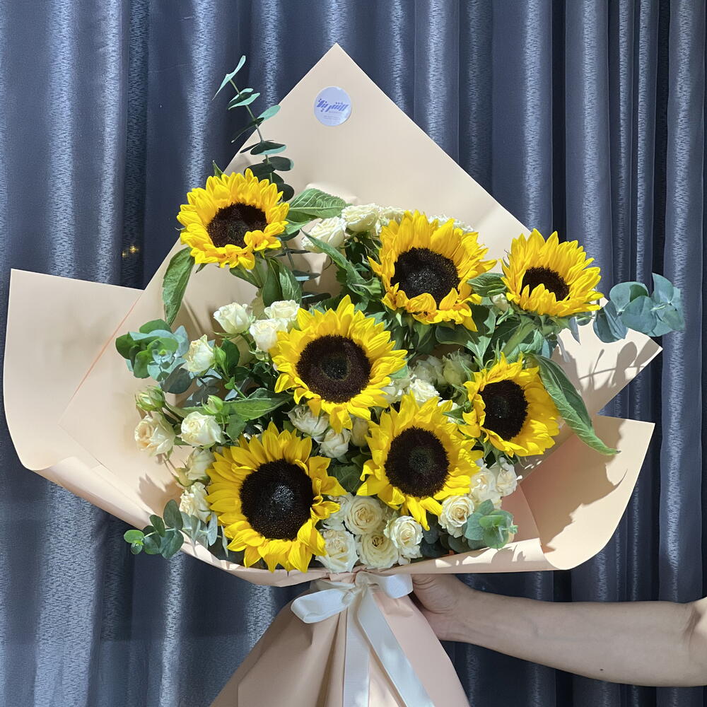 Irradia alegría y calidez con nuestro ramo Florists Special, hábilmente arreglado con 7 vibrantes girasoles, envuelto de forma intrincada en 5 piezas de papel de alta calidad y delicadamente acentuado con 3 preciosas rosas miniatura. El regalo perfecto para iluminar cualquier ocasión.