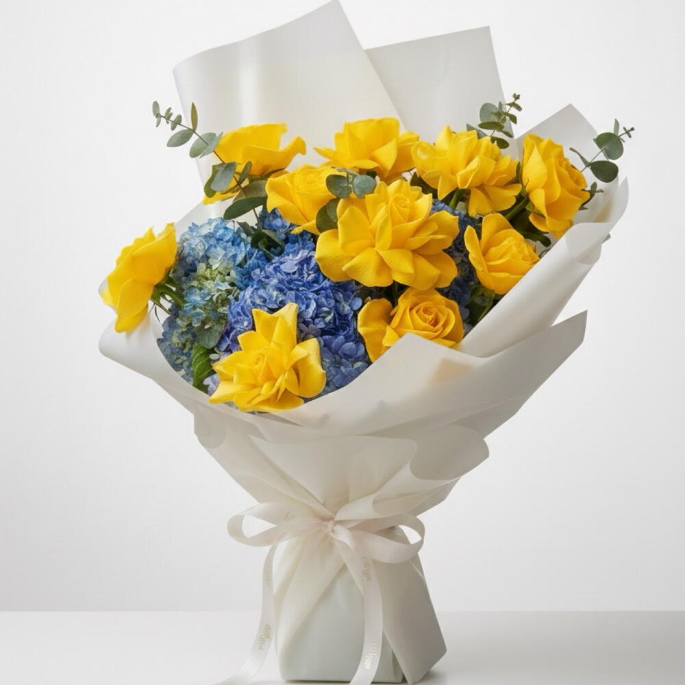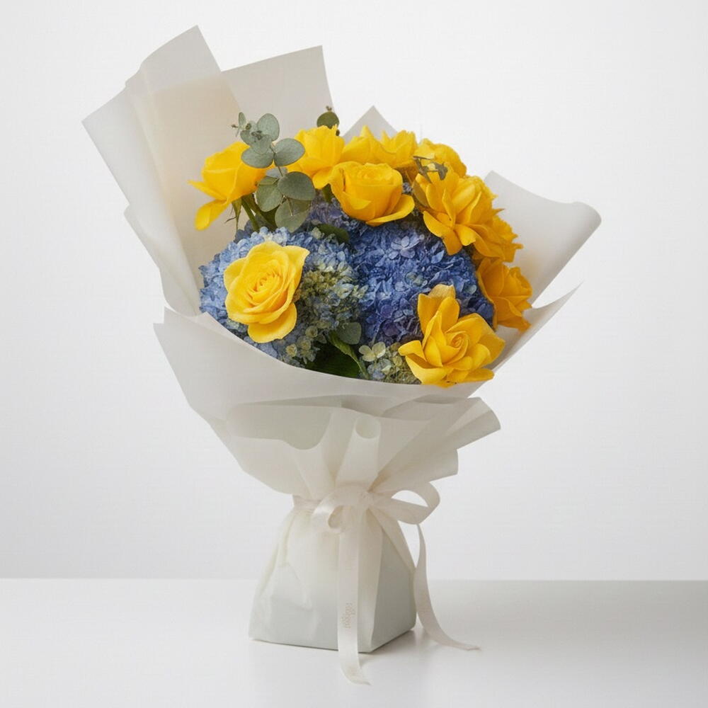 Brillante, fresco y lleno de energía positiva, Sun Meets Sky combina 12 radiantes rosas amarillas con 2 exuberantes hortensias azules, con un toque fresco de eucalipto para un toque limpio y moderno. Las rosas amarillas transmiten calidez, alegría y amistad, mientras que las hortensias azules aportan una profundidad serena y un contraste fresco y soñador. Juntas, crean un ramo optimista, equilibrado y naturalmente inspirador. ✨ Detalles del ramo • 💛 12 rosas amarillas • 💙 2 hortensias azules • 🌿 Detalles frescos de eucalipto • 💐 Atado a mano, acabado de floristería 💖 Ambiente Soleado • Tranquilo • Fresco • Moderno 🎁 Perfecto para • Felicitaciones de cumpleaños • Regalos de agradecimiento • Nuevos comienzos • Sorpresas que alegran