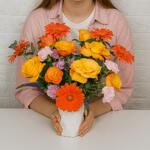 Gerbera - 5 ud. orange rose - 7 ud. jarrón de cerámica - 1 ud. filtro verde - 3 ud. broche de clavel - 5 ud.