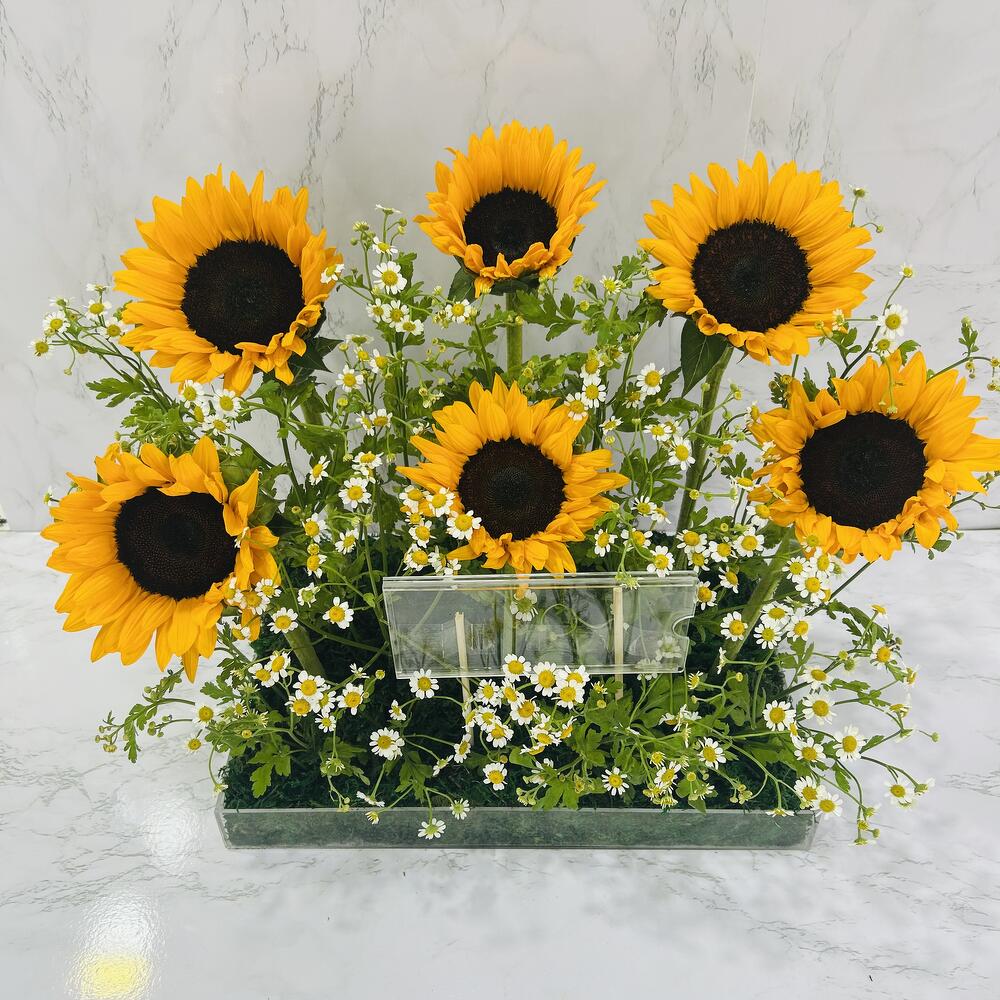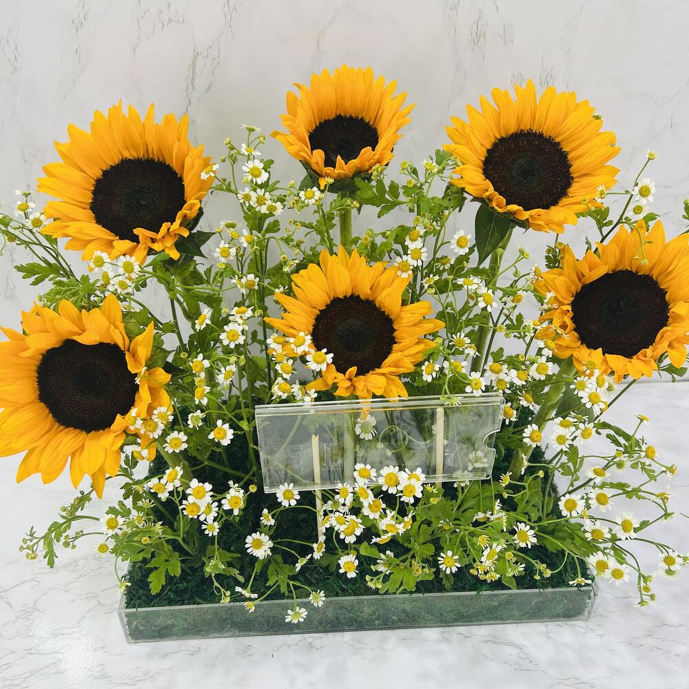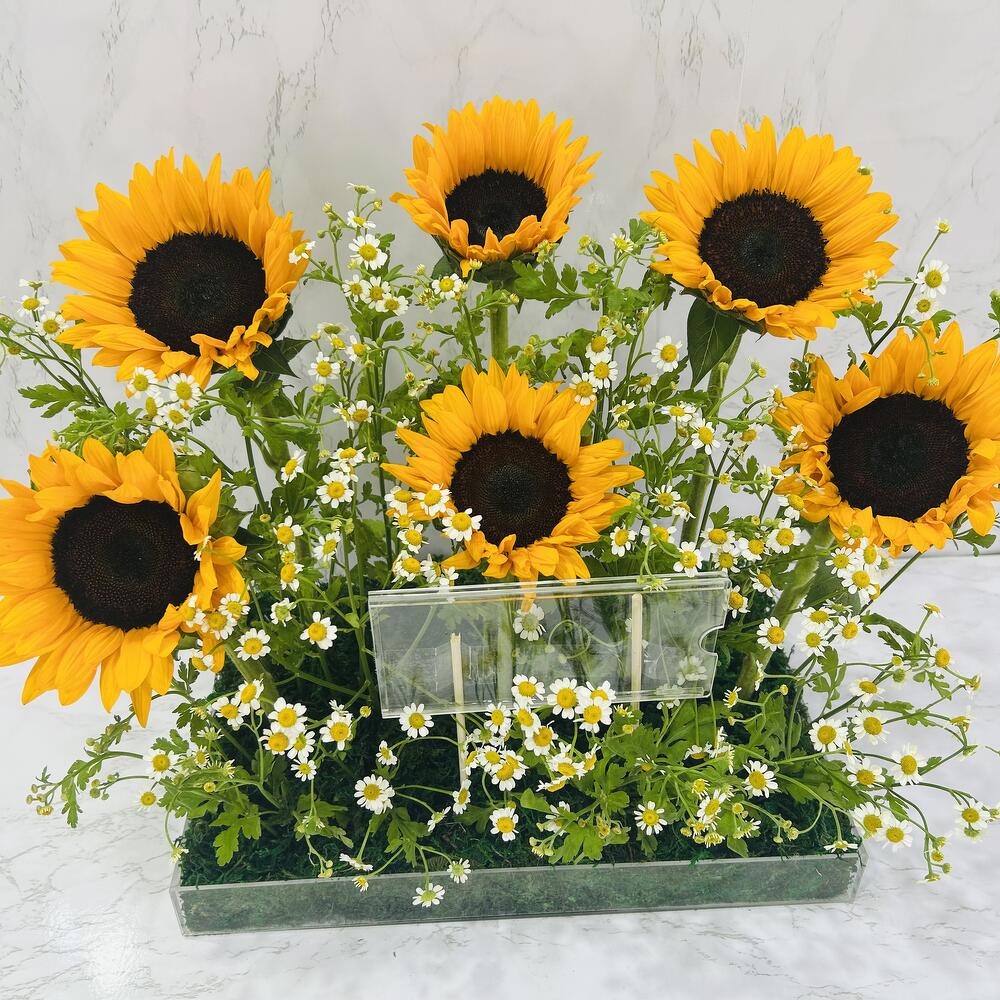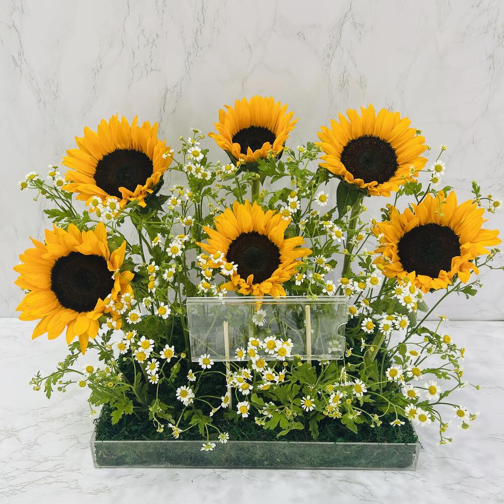 Sunflower - 6 ud. áster blanco - 10 ud. bandeja acrílica - 1 ud. alcancía acrílica - 1 ud.
