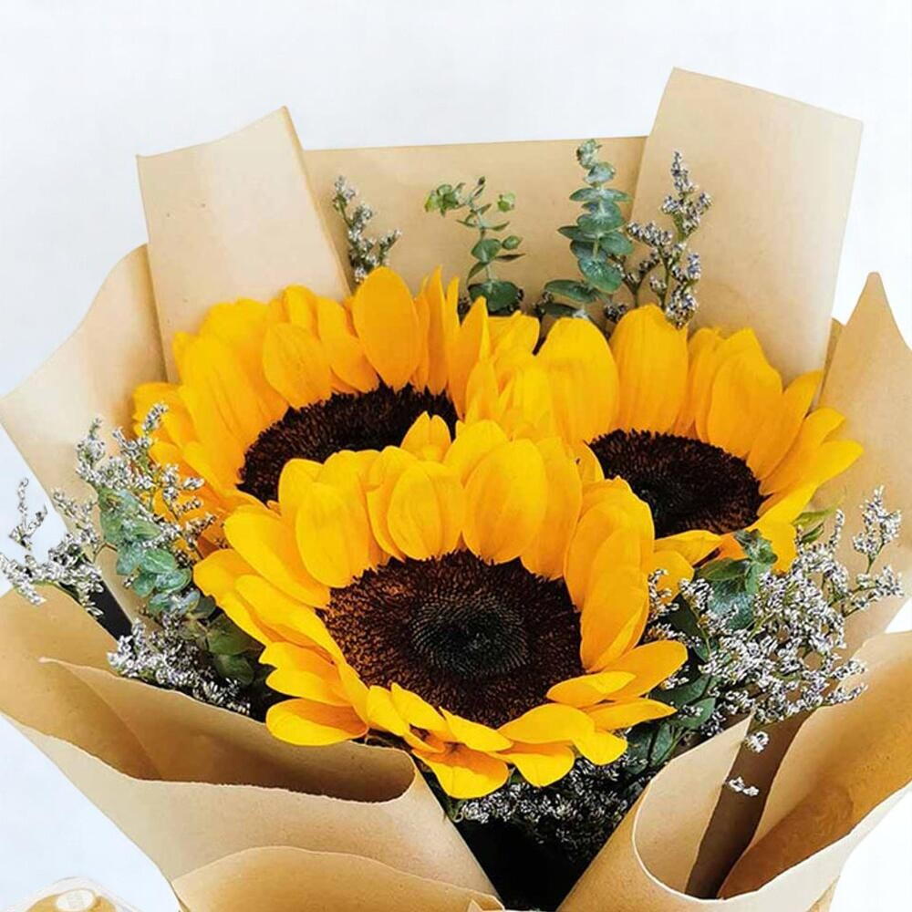 La cinta - 1 ud. Eucalyptus - 3 ud. Limonium - 3 ud. Sunflower - 3 ud. Wrapping - 3 ud.