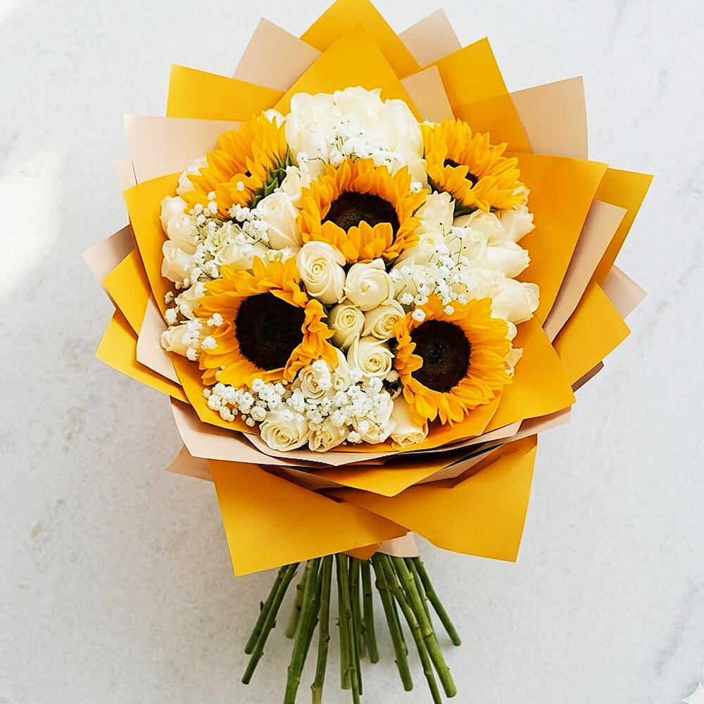 Sunshine Serenity Giant Sunflowers 51 White Roses | Same Day Dubai Wild and pure. Loud and calm. Bold and serene. The Sunshine Serenity Bouquet brings together what seems like opposite worlds — five towering golden sunflowers and fifty-one pristine white roses wrapped in our signature gold paper to create the most visually arresting mixed bouquet in Dubai. Where sunflowers bring energy, white roses bring grace. Together, they create something that cannot be described until its seen. This is the bouquet for the person who contains multitudes. Whats included: ✔ 5 premium giant sunflowers at peak golden bloom ✔ 51 premium white roses hand-selected, full bloom ✔ Babys breath and green foliage accents ✔ Signature gold luxury wrap ✔ Personalised message card your words, our artistry ✔ Same-day delivery across Dubai The Contrast: Theres something deeply satisfying about a bouquet that cant be put in a single category. The sunflowers say Im here. The white roses say Im yours. Together, they say everything at once. This is the bouquet that stops conversations. Perfect for: 🌻 Birthdays for the one who lights up every room 🎓 Graduation gold for achievement, white for new beginnings 🏠 Housewarming the first flowers that fill a new home with joy 👼 New Baby sunshine for the new arrival, white for pure new beginnings 💼 Congratulations the achievement gift that matches the energy ✨ Just Because for someone who deserves both sunshine and serenity today same-day delivery across Dubai.