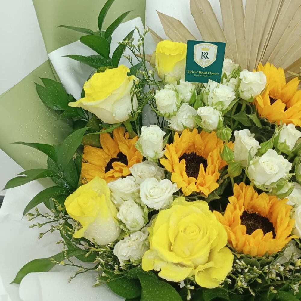 Un ramo radiante de flores amarillas alegres y suaves rosas blancas, bellamente envuelto con exuberantes toques verdes—perfecto para transmitir felicidad, positividad y cálidos deseos en cualquier ocasión.