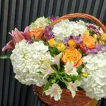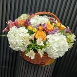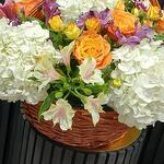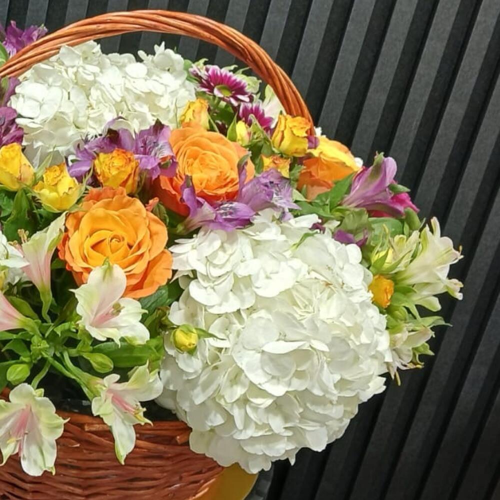 Basket - 1 ud. alstroemeria blanca - 3 ud. pink alstroemeria - 2 ud. orange rose - 6 ud. white hydrangea - 5 ud. crisantemo rosa - 2 ud. pink lily - 1 ud. mini rosa amarilla - 3 ud.
