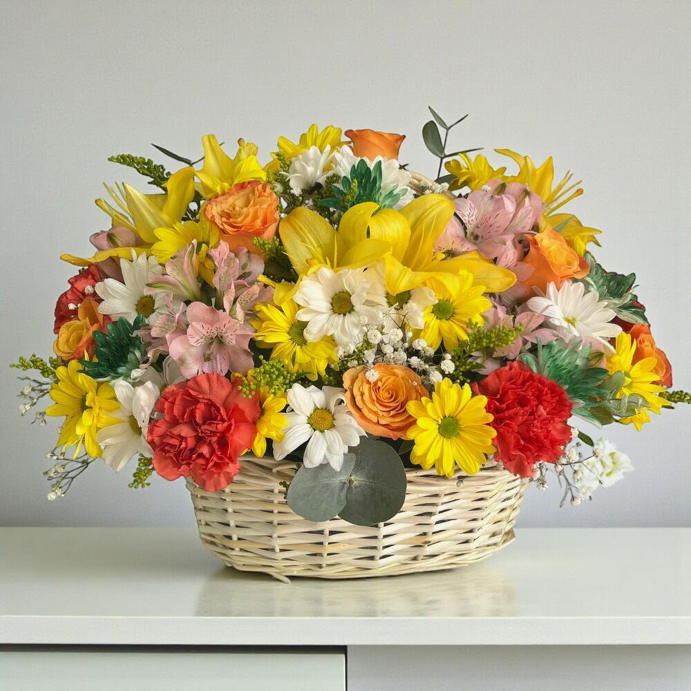 Brillante, alegre y llena de corazón, nuestra Cesta con Encanto Amanecer es una radiante mezcla de colores y flores diseñada para elevar, inspirar y deleitar. Este alegre arreglo incluye: 🧡 6 vivaces rosas naranjas para energía y admiración 💛 2 suaves lirios amarillos para serenidad y luz 🤍 3 margaritas blancas para inocencia y alegría 💚 3 crisantemos verdes para frescura y armonía 🌸 4 delicadas alstroemerias rosas para cariño y amistad ☀️ 2 crisantemos amarillos para completar la vibrante mezcla Todas las flores están cuidadosamente dispuestas en una canasta tejida cuidadosamente seleccionada, lo que la convierte en el regalo perfecto para: 🎁 Cumpleaños 🏡 Inauguraciones 🎉 Los momentos cotidianos merecen ser celebrados 💐 Sorpresas "porque sí" Ya sea colocada en un rincón acogedor o regalada con cariño, la Cesta con Encanto Amanecer lleva la luz del sol y la elegancia floral dondequiera que vaya. Haz tu pedido ahora para alegrar un corazón o un hogar con los colores más alegres de la naturaleza.