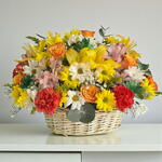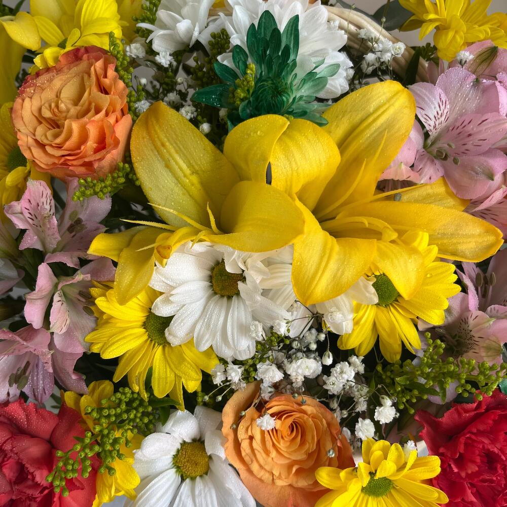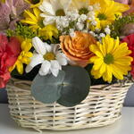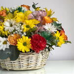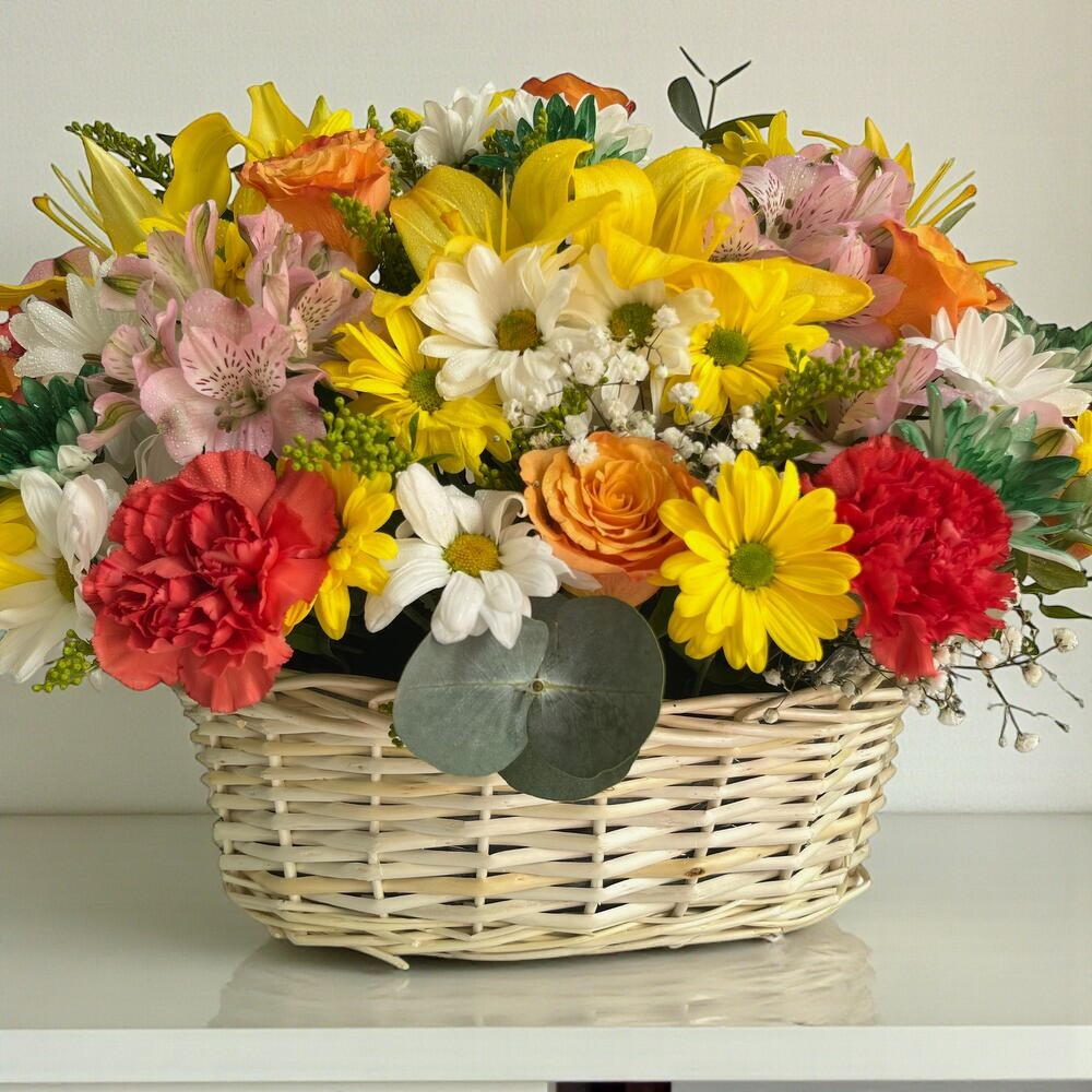 Basket - 1 ud. White daisies - 3 ud. lirios amarillos - 2 ud. crisantemos verdes - 3 ud. alstroemeria rosa - 4 ud. crisantemos amarillos - 2 ud. rosas naranjas - 6 ud.