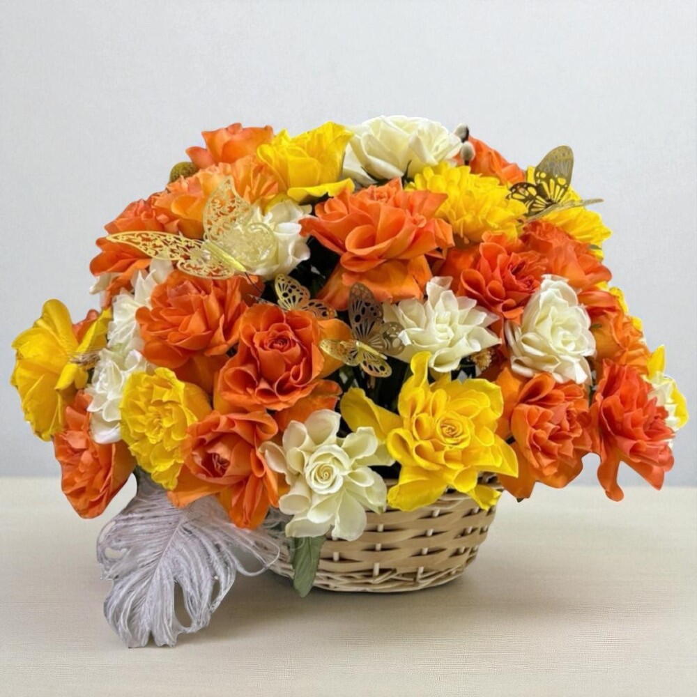 Disfruta de la pura belleza de nuestro arreglo Flores en una cesta. Descubre una caja artísticamente elaborada, hogar de una impresionante composición de flores. El espectáculo es una vibrante mezcla de 30 cautivadoras rosas naranjas entrelazadas con 30 encantadoras rosas amarillas, y acompañadas de 10 encantadores accesorios. Es una manera ideal de expresar tu amor, celebrar una ocasión especial o simplemente añadir un toque de color a tu hogar. Deléitate con el encanto de esta composición floral. Aprecia los detalles, siente el amor que florece en cada pétalo.