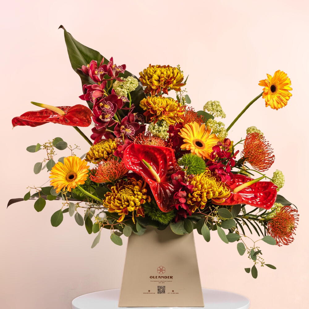 Gerbera - 3 ud. Anthurium - 3 ud. nutan - 4 ud. crisantemo - 6 ud. eucalipto - 10 ud. symbedium - 1 ud. strelitzia - 3 ud.
