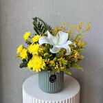 Solidago - 10 ud. crisantemo amarillo - 3 ud. hojas de palma - 2 ud. eucalyptus leaves - 5 ud. lirio blanco - 1 ud. green vase - 1 ud.
