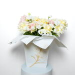 Eustoma - 5 ud. Pistacia - 5 ud. hydrangea pink - 1 ud. luz de vela - 7 ud. mundial rosa - 5 ud.