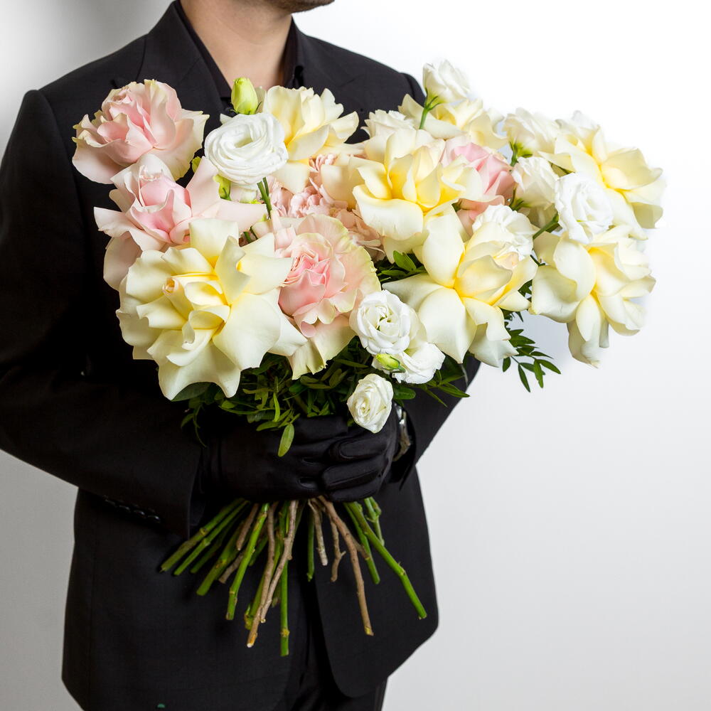 Eustoma - 5 ud. Pistacia - 5 ud. hydrangea pink - 1 ud. luz de vela - 7 ud. mundial rosa - 5 ud.