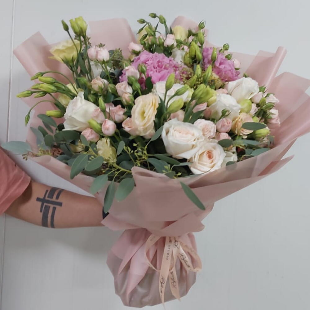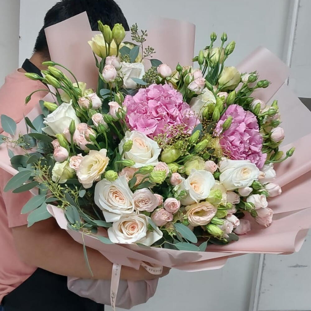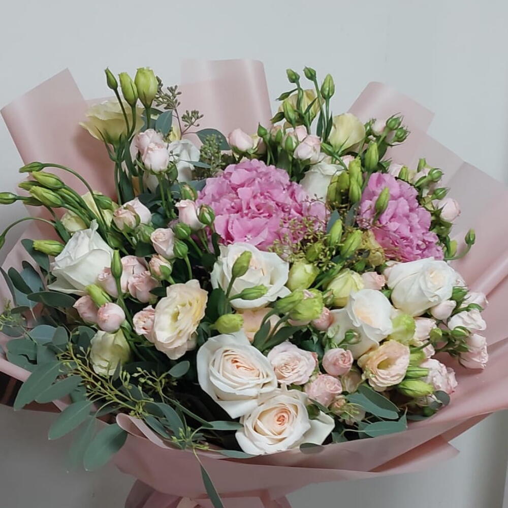 hortensias rosadas - 2 ud. bebé rosa melocotón - 10 ud. o’hara rosa blanca - 10 ud. lucianthus blanco o melocotón - 10 ud. bayas de eucalipto - 10 ud.