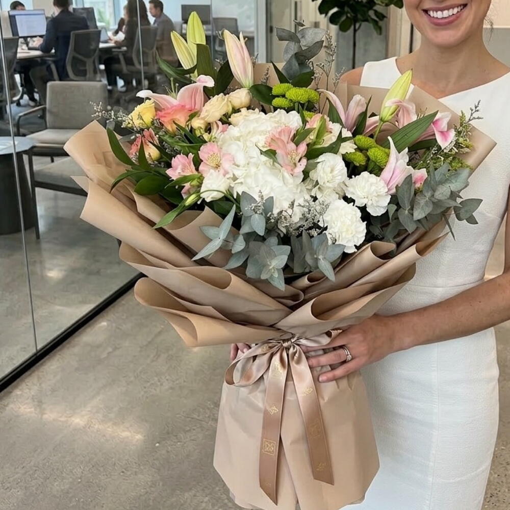 Eucalyptus - 4 ud. Son los lirios - 2 ud. claveles blancos - 3 ud. pink alstroemeria - 2 ud. white lisianthus - 2 ud. white hydrangea - 1 ud. crisantemo botón verde - 2 ud. rosas en spray color melocotón - 2 ud. eustoma melocotón - 1 ud.