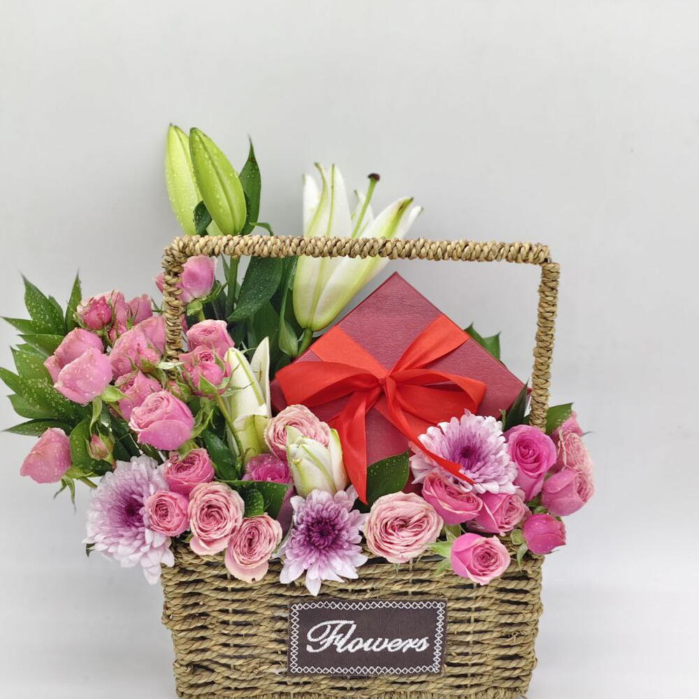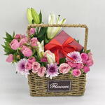 Ruskus - 4 ud. cesta de flores - 1 ud. pink spray roses - 4 ud. tallo de lirio - 1 ud. tallo de crisantemo lila claro - 1 ud. caja de chocolates 250 g - 1 ud.