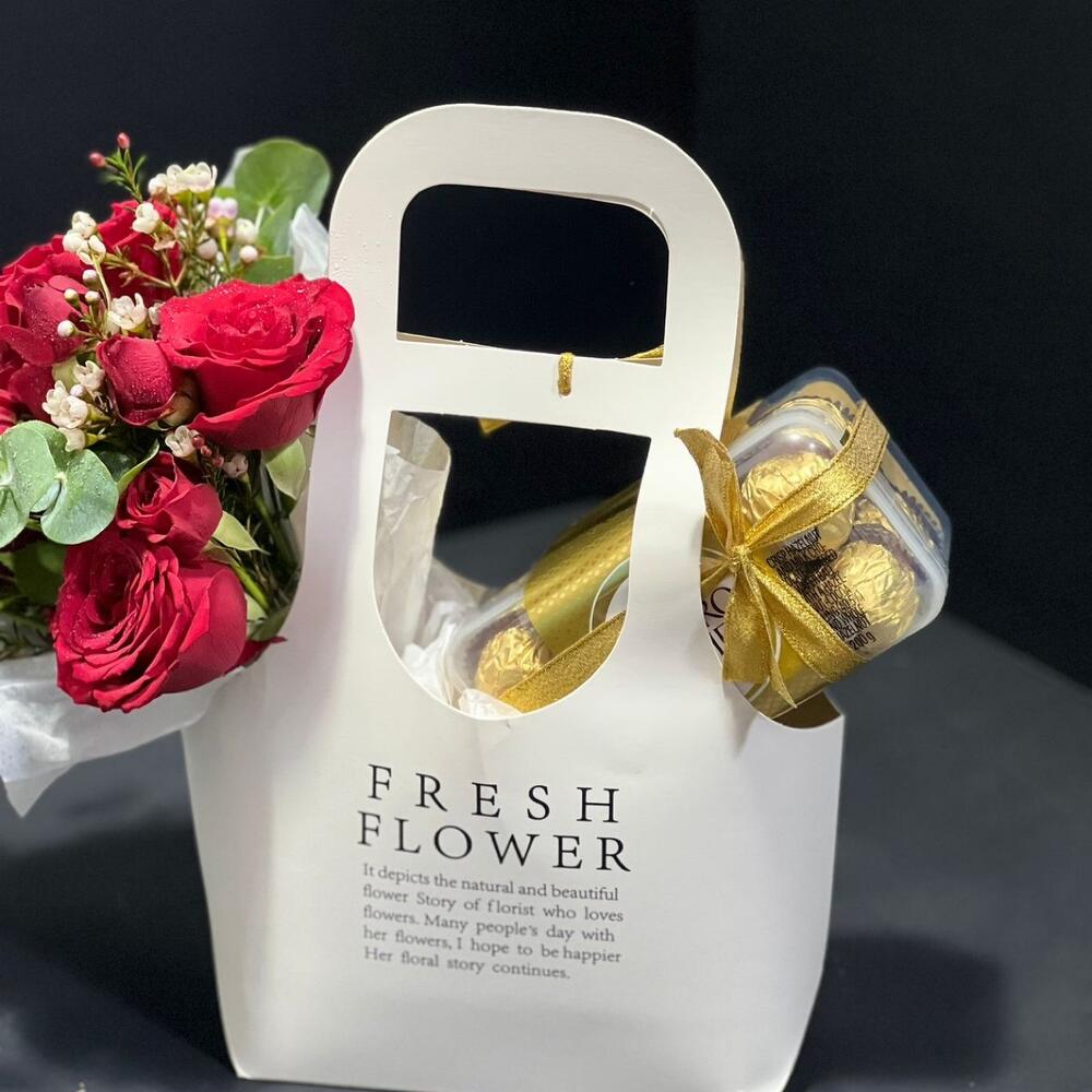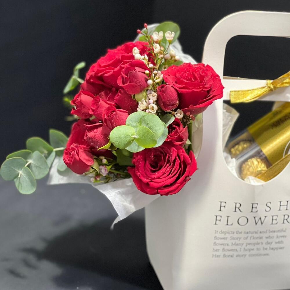 Red rose - 5 ud. Eucaliptus - 2 ud. rosa ramificada roja - 2 ud. chocolate Ferrero - 16 ud. flor de cera o hipérico - 2 ud. bolsa con flor blanca - 1 ud.