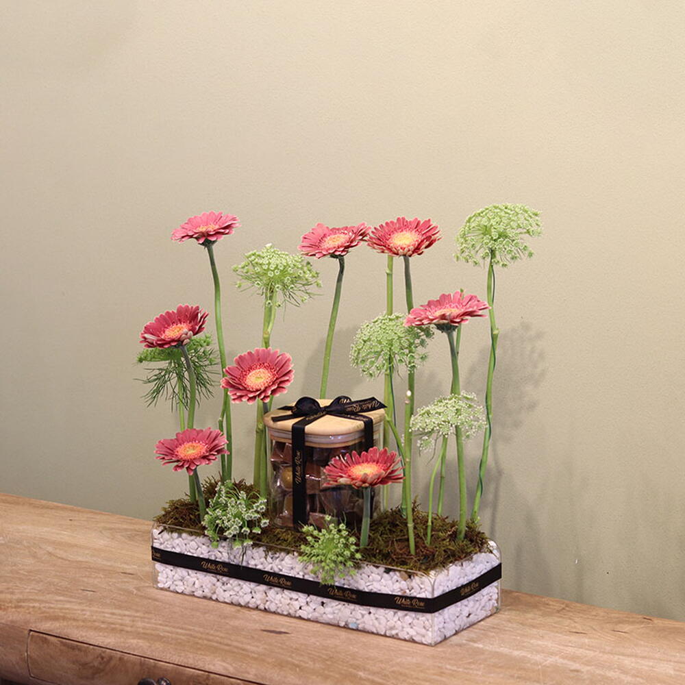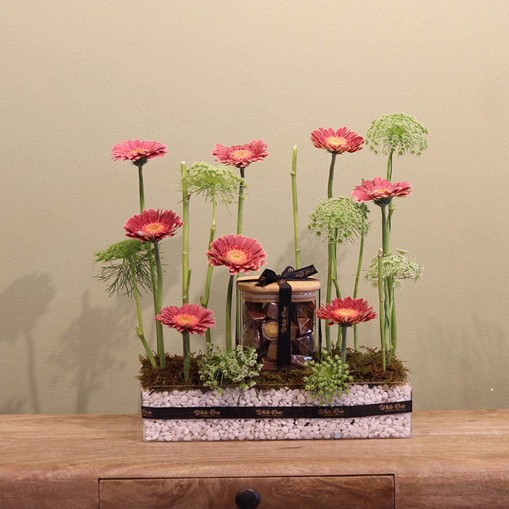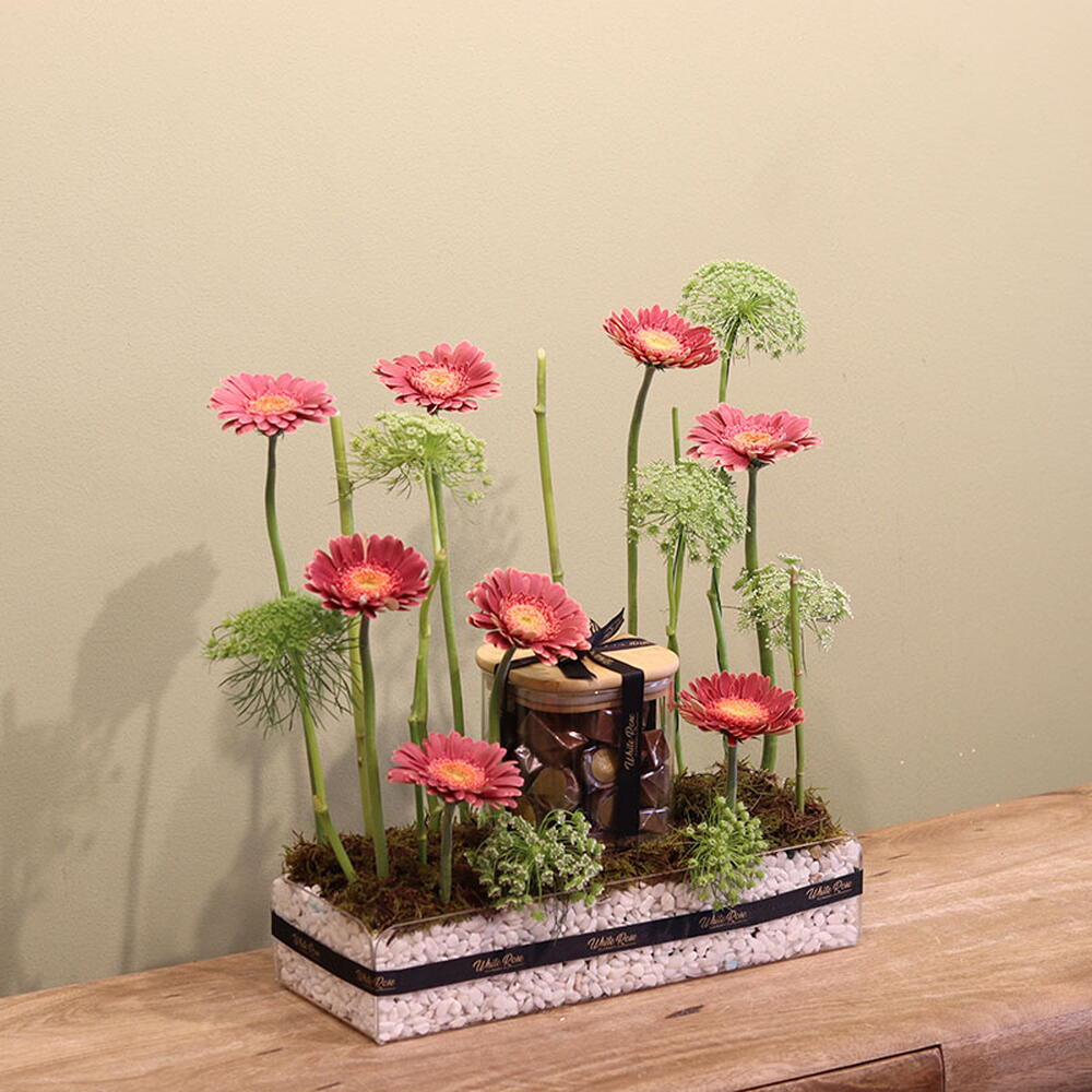 Moss - 1 ud. Gerbera - 8 ud. Chocolate - 450 gr bandeja acrílica - 1 ud.