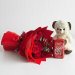 Un combo romántico de San Valentín que incluye un ramo de 21 rosas rojas, un osito de peluche suave y chocolates Lindt Lindor de leche, cuidadosamente seleccionado para expresar amor, calidez y dulzura en un hermoso regalo.