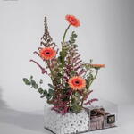 Gerbera - 4 ud. Wax flower - 3 ud. astilbe - 3 ud. chocolates - 1000 gr