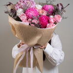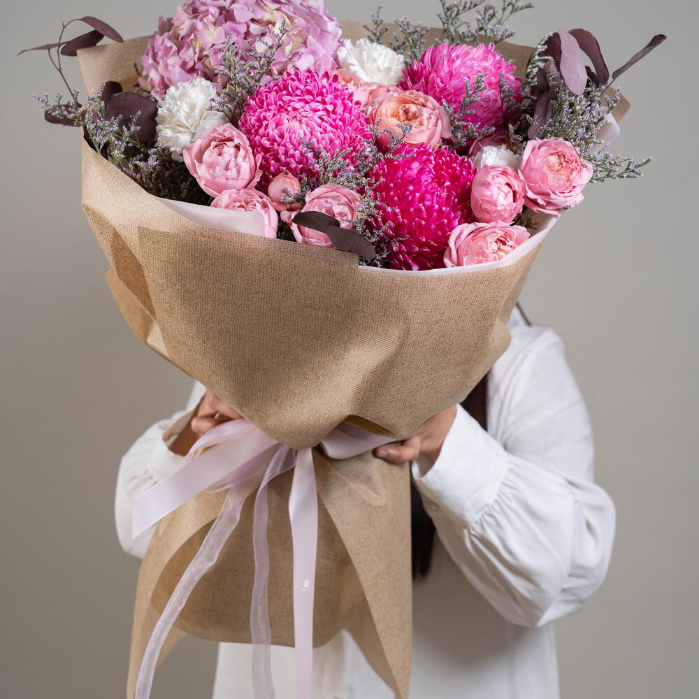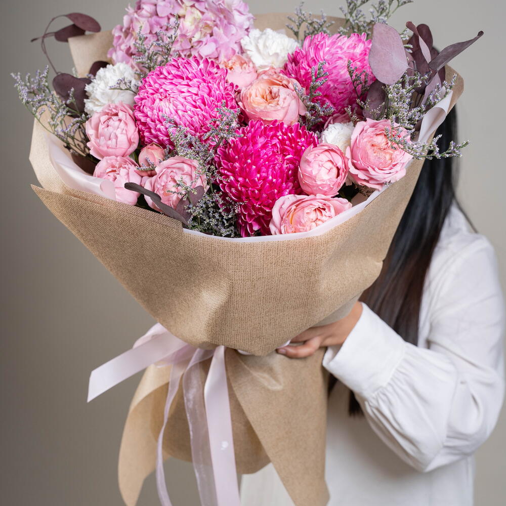 Limonium - 3 ud. hydrangea pink - 2 ud. clavel blanco - 5 ud. rosa spray julietta rosa - 5 ud. decoración rosa - 5 ud. eucalipto rojo - 5 ud.