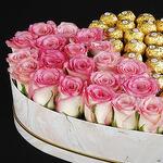 Experimente el exquisito encanto de este Mono Bouquet, cuidadosamente compuesto por 20 impresionantes rosas Jumiliya. El encantador aroma floral se complementa perfectamente con un toque de lujo: 25 piezas de deliciosos bombones Ferrero Rocher. Todo presentado de forma hermosa en una estilizada caja con forma de corazón. Este elegante ramo expresará sus sentimientos a la perfección, haciendo que cualquier ocasión sea especial.