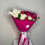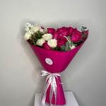 Wrapping - 1 ud. rosa blanca en aerosol - 6 ud. matthiola blanca - 1 ud. rosa fucsia brillante - 9 ud.