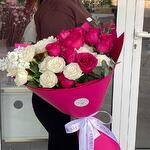 Hermosa composición floral con rosas de color rosa brillante y rosas spray blancas