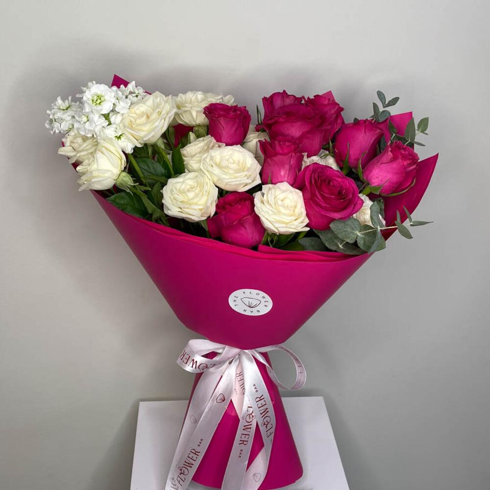Hermosa composición floral con rosas de color rosa brillante y rosas spray blancas