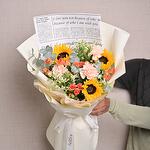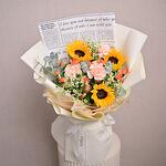Un ramo equilibrado de 3 girasoles, 3 claveles color durazno, 3 mini rosas naranjas, tanaceto y eucalipto. Ideal para regalar de forma alegre y atenta.