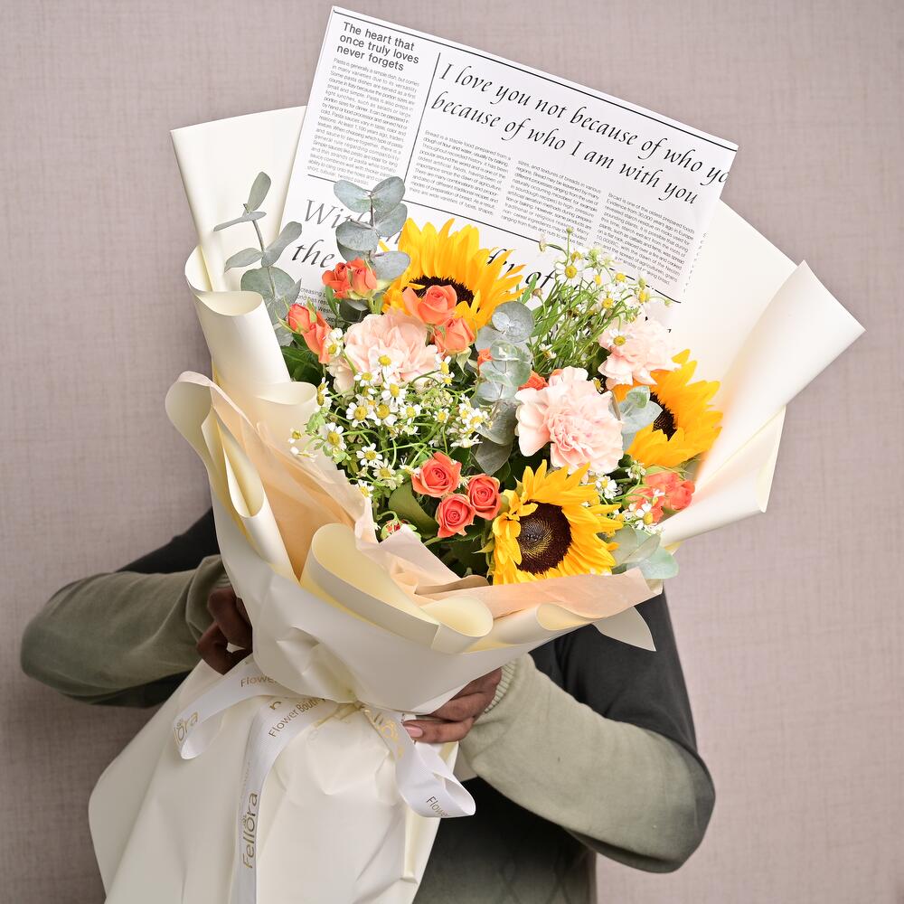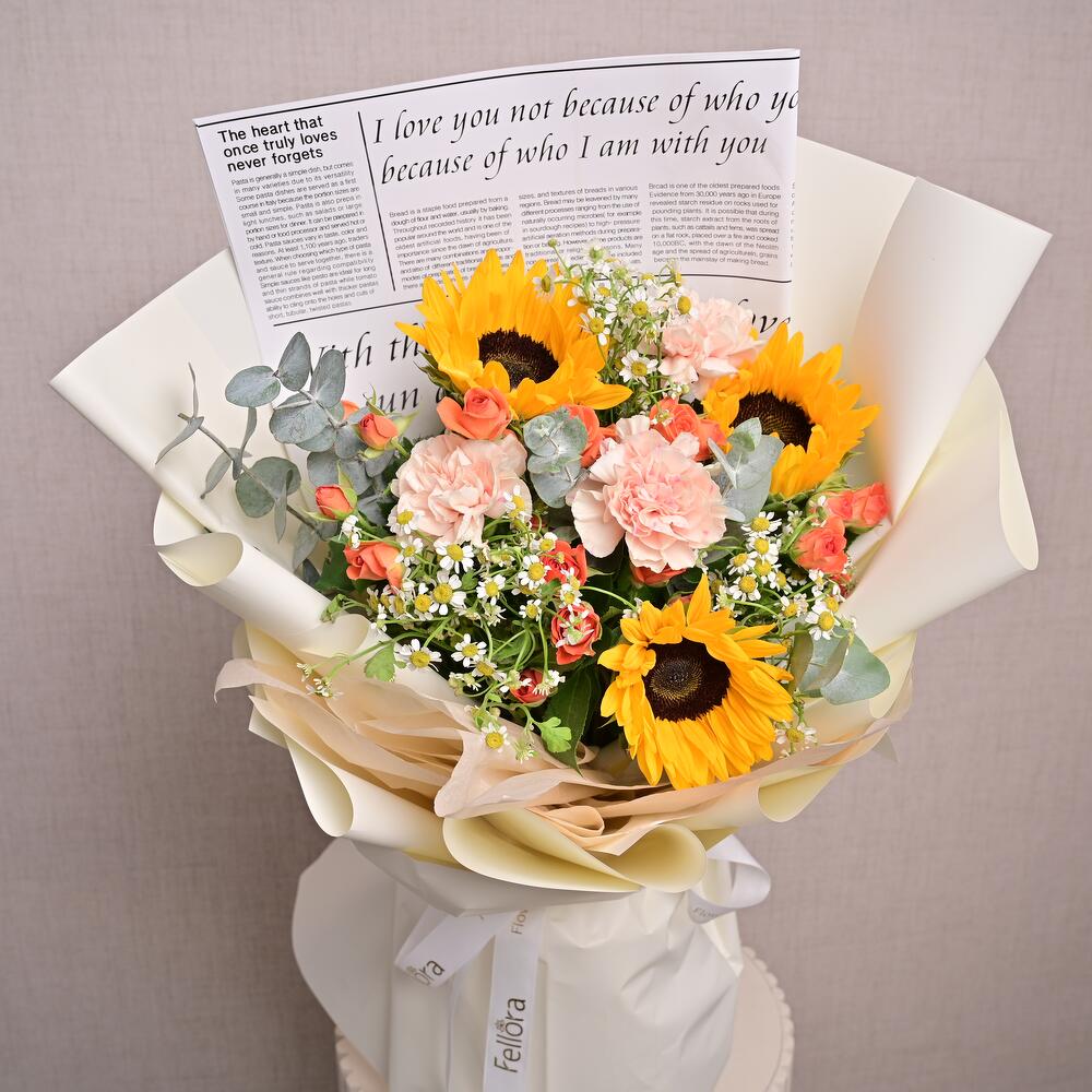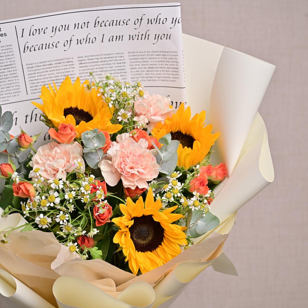 Un ramo equilibrado de 3 girasoles, 3 claveles color durazno, 3 mini rosas naranjas, tanaceto y eucalipto. Ideal para regalar de forma alegre y atenta.