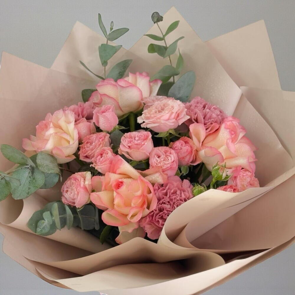 Un encantador ramo de San Valentín con suaves rosas en tonos durazno y rosa, acentuado con follaje fresco, elegantemente envuelto en tonos neutros. Un regalo elegante para expresar amor, calidez y afecto.