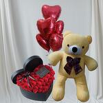Haz que su corazón dé un vuelco con este combo de ensueño! Una caja con forma de corazón llena de exuberantes rosas rojas, acompañada de adorables globos en forma de corazón y un tierno osito de peluche — la manera perfecta de decir te quiero o de hacer que cualquier día se sienta extra especial. Ideal para cumpleaños, aniversarios o simplemente porque sí