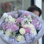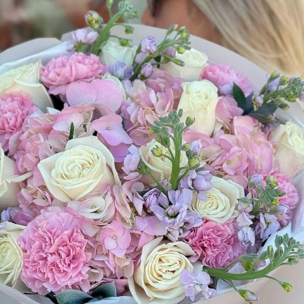 claveles rosas - 6 ud. hortensia rosa - 4 ud. rosas blancas - 15 ud. matthiola lila - 8 ud.