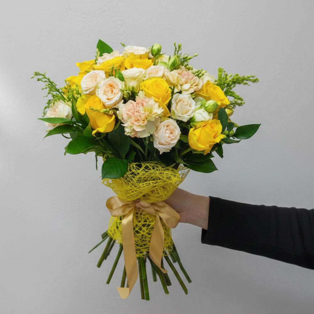 Un ramo fresco y alegre lleno de tonos soleados y de delicada elegancia. Las rosas amarillas brillantes aportan calidez y felicidad, mientras que las suaves flores color crema añaden un toque delicado y romántico. El frondoso follaje verde realza la belleza natural y la frescura del arreglo. El ramo está envuelto en una malla decorativa ligera y rematado con una cinta dorada para un aspecto alegre pero refinado. Sus colores equilibrados crean una sensación de armonía y positividad. Perfecto para cumpleaños, celebraciones o regalos de agradecimiento sinceros. Este ramo es una hermosa manera de compartir luz, alegría y emociones sinceras.